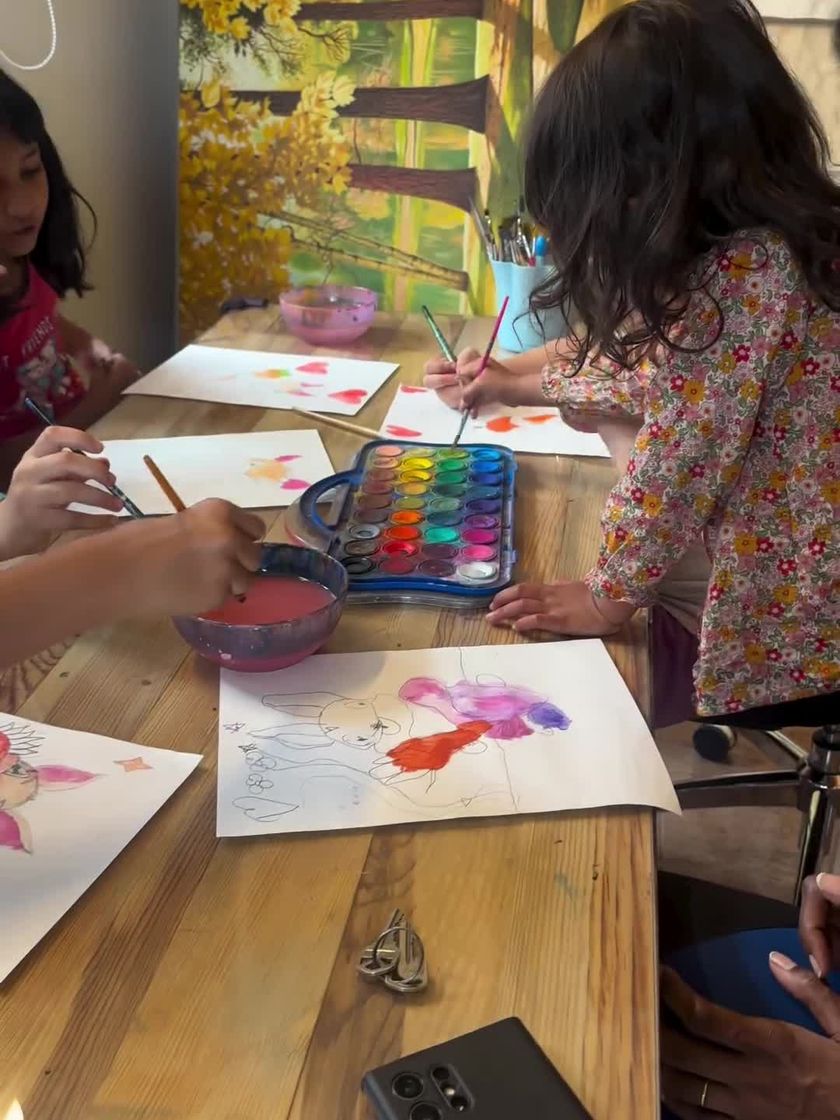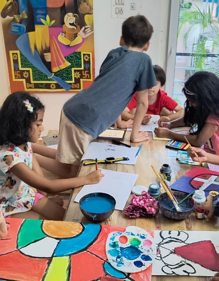 Welcome to our art studio, located in Adarsh Palm Meadows, Bangalore. It is a warm, inviting, and well-lit space designed to inspire creativity, where we host our daily classes, workshops, and birthday parties.
