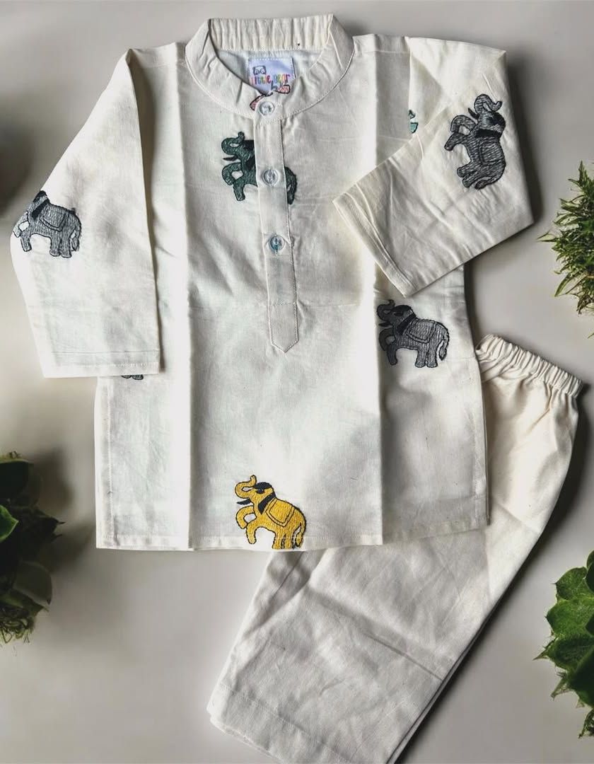 My collection for boys is all about classic styles with a playful twist. Here you’ll find soft cotton kurta sets, versatile bandi (Nehru jacket) sets that can be layered, and unique pieces with cute animal embroidery, all designed to be comfortable enough for hours of play.