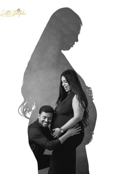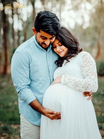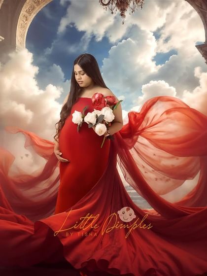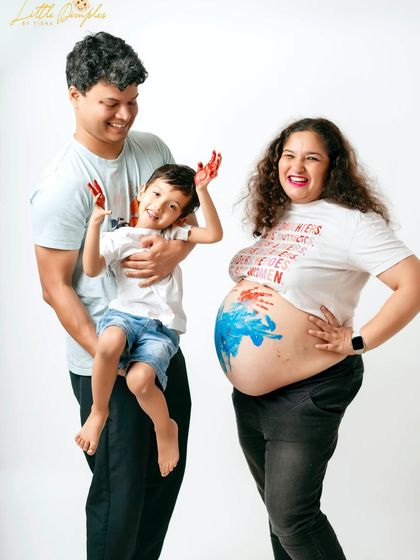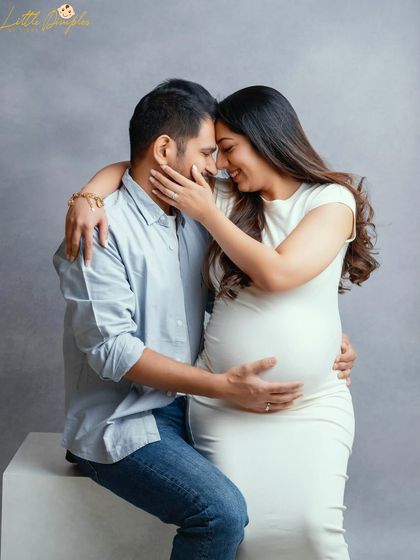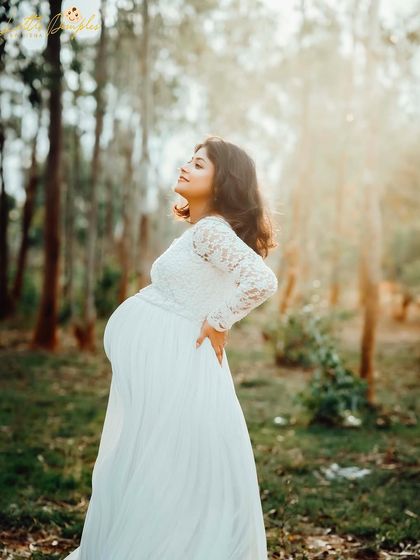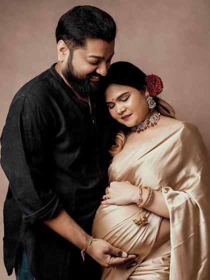 I do maternity photoshoots in my Bangalore studio or outdoors, provide gowns and props, and include your family or pets if you want.