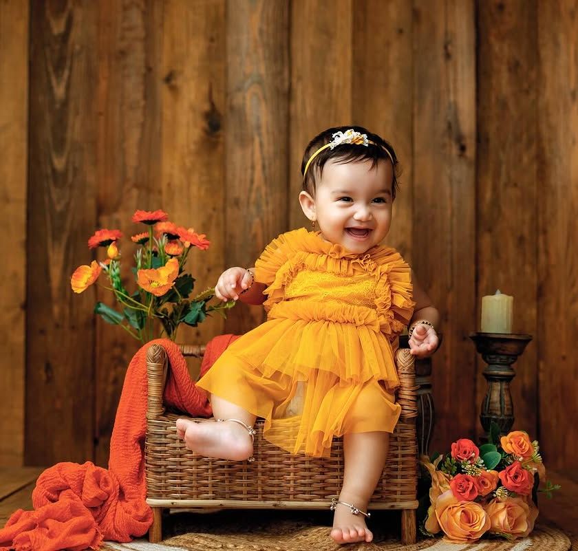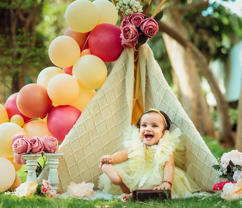 I love taking sessions outside into the beautiful parks and gardens of Bangalore, especially during the magical golden hour. These shoots are perfect for capturing candid, natural moments of your children as they play and explore. We can create various themes, from a traveler setup with vintage suitcases to a simple picnic in an orchard.