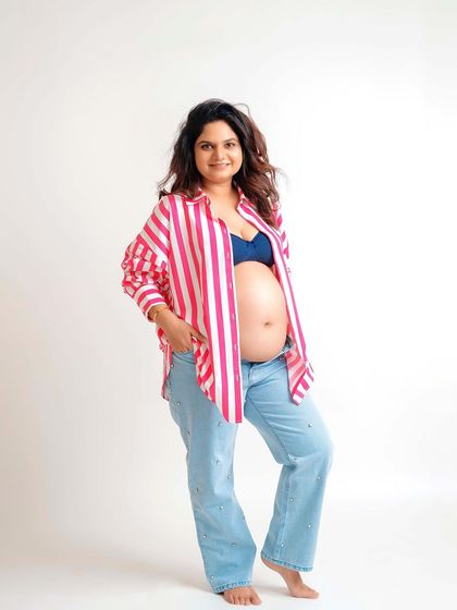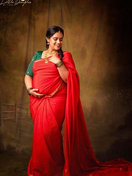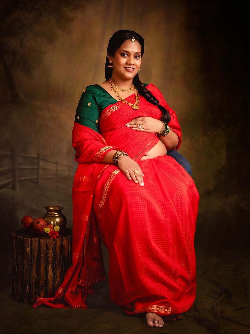 I specialize in creating artistic pregnancy portraits with a traditional touch. These studio sessions celebrate the grace of the saree, using painterly backdrops and classic props to create images that feel like timeless works of art, perfect for honoring your heritage.
