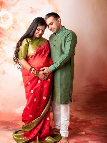 Whether you want solo maternity portraits or want to include your partner, I make sure the focus is on what feels true to you. We can shoot in a green park if you love the outdoors, or in my studio with simple or soft backdrops. I’ve got gowns, sarees, tiaras, and flowing fabrics, but you can totally bring your own style too. I really believe maternity photos with props add that extra bit of charm.