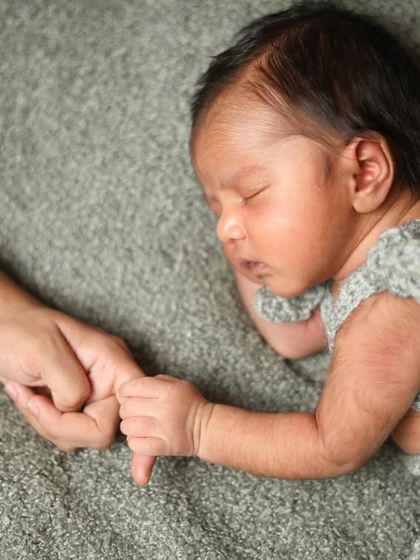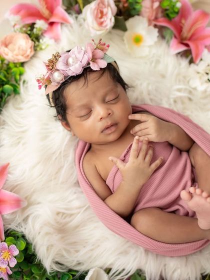 We photograph newborns up to 10 weeks with classic and creative setups, offer both studio and in-home sessions, and include family members in the shoot.
