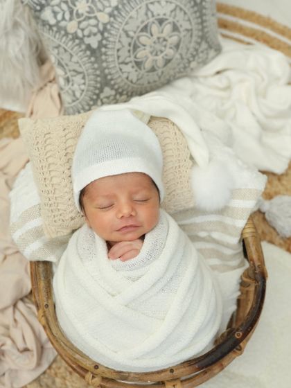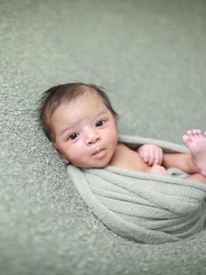 We photograph newborns up to 10 weeks with classic and creative setups, offer both studio and in-home sessions, and include family members in the shoot.