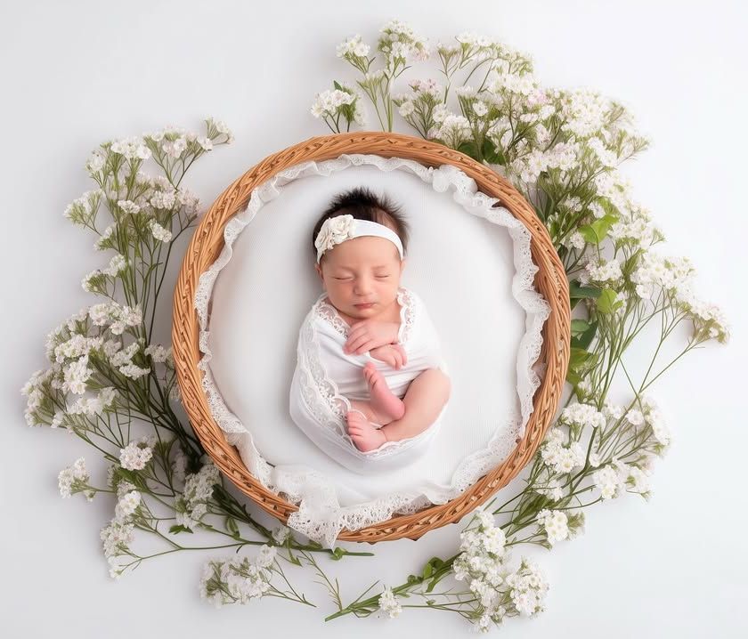 I specialize in creating serene, storybook portraits of your newborn in their first few weeks. My studio is a safe, warm, and calm space where I patiently pose your baby using soft wraps, delicate props, and timeless setups to capture their fleeting innocence.