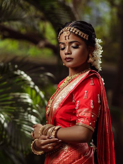 I create authentic and radiant looks for South Indian brides, from Tamil to Malayali ceremonies. My technique focuses on achieving a dewy, long-lasting base that withstands humidity, paired with classic elements like defined eyes and traditional hair adornments.