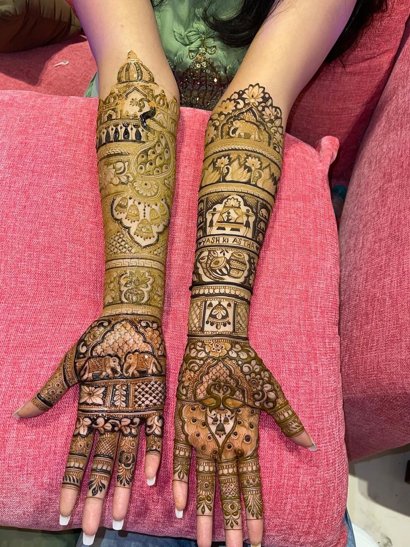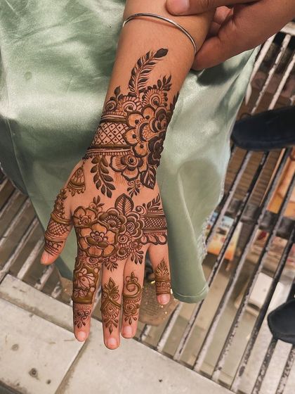 My bridal mehndi is all about detail and telling your story. I create full, elaborate designs from your fingertips to your elbows, using traditional Rajasthani and Madhubani styles filled with motifs like palaces, elephants, and peacocks.