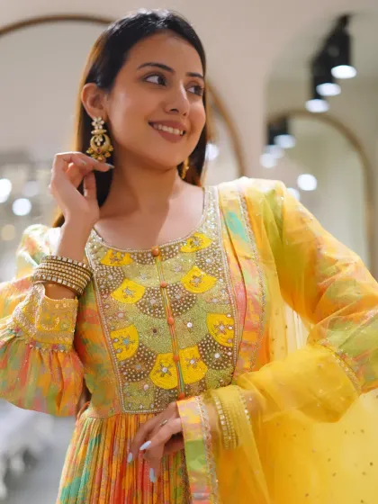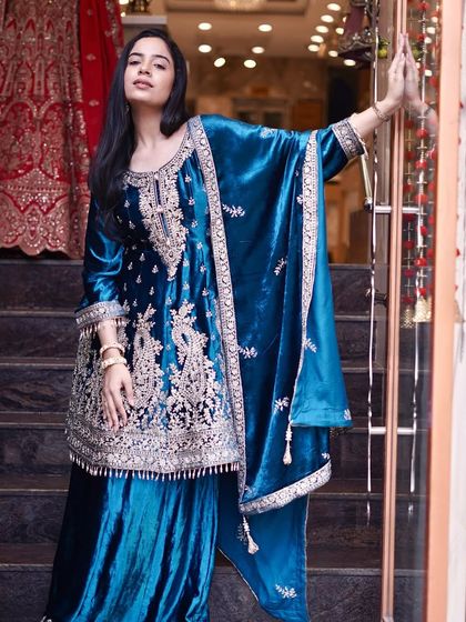 We offer ethnic and festive wear like Anarkalis, pre-draped sarees, velvet suits, and customisable outfits for weddings and celebrations, all ready to wear and easy to personalise.