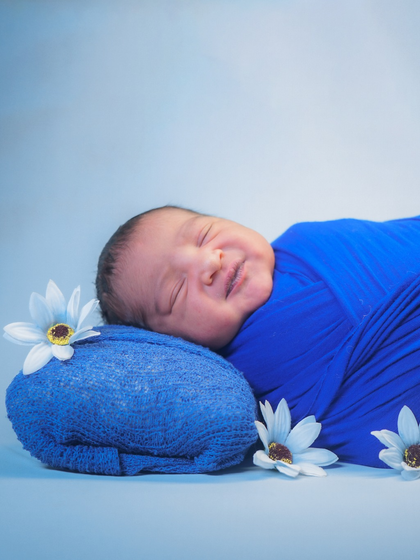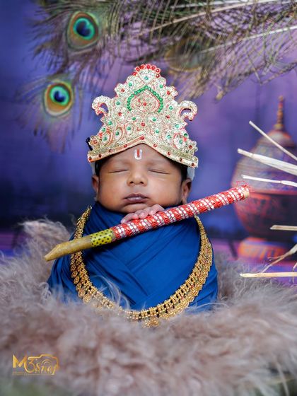 I have a big collection of creative baby themes and props. Want your baby as a Little Krishna, a chef, or a tiny scholar? I’ve got you. I bring all the wraps, baskets, hats, and headbands. We can pick themes together and make it personal.