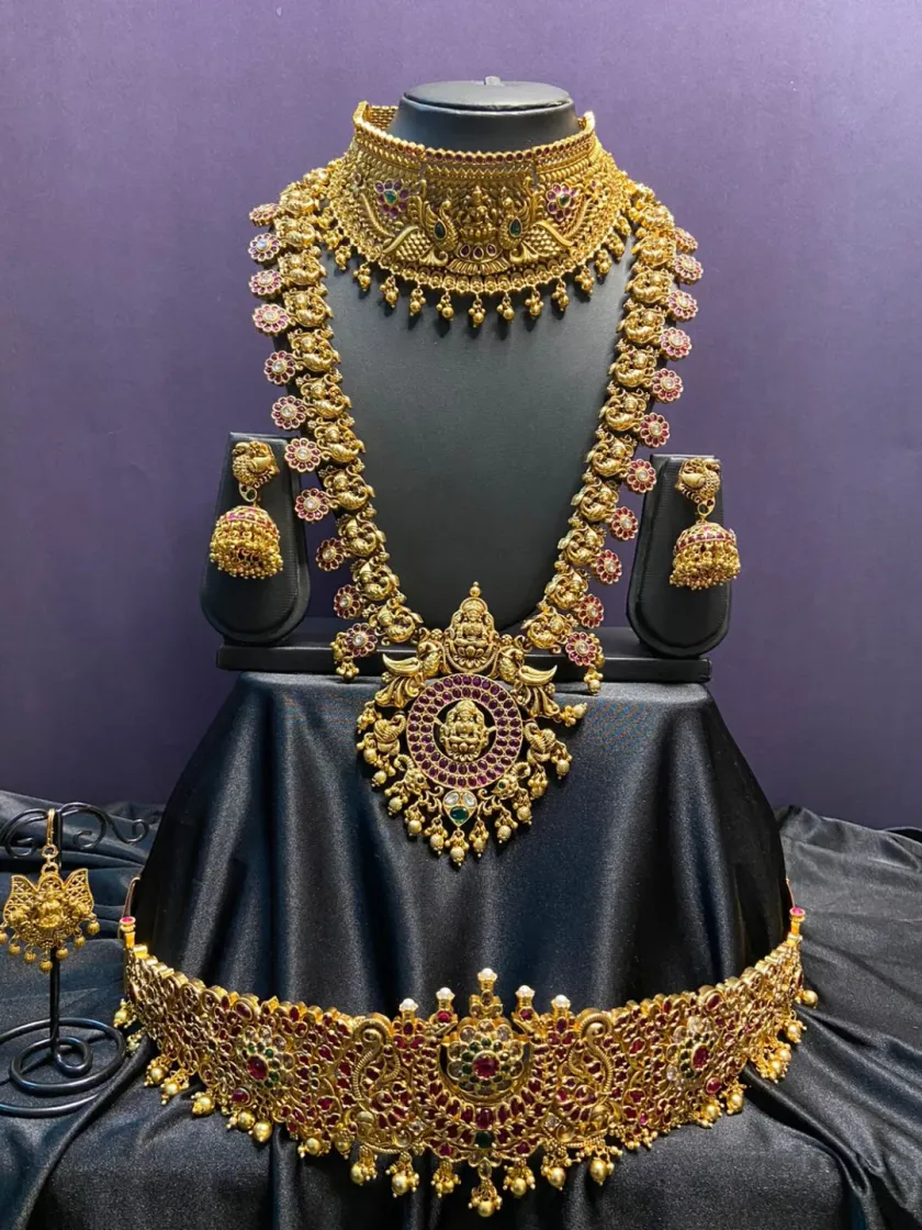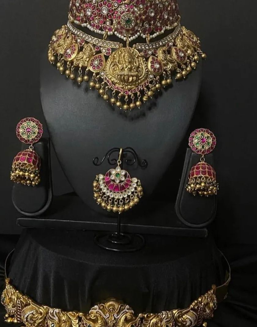 This collection is for the main event. I have curated full bridal sets in classic South Indian temple, kemp, and Nagakshi styles with an antique gold finish. These sets typically include everything you need: a choker, one or two long necklaces (haarams), jhumkas, maang tikka, and a vaddanam (waist belt).