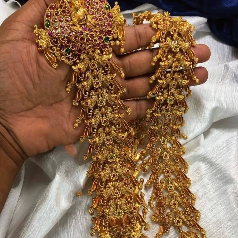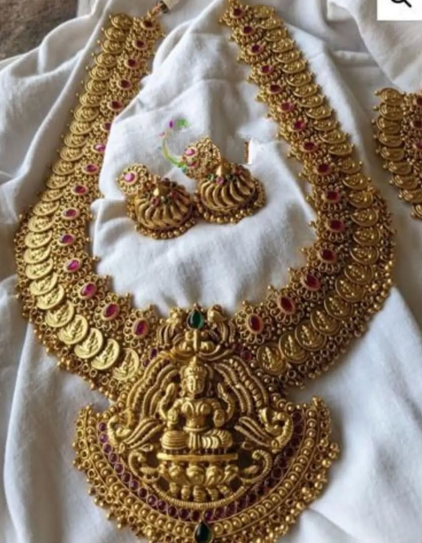 Add a layer of grandeur to your look by renting one of my statement haarams or long necklaces. I have a variety of styles, including traditional kasumalai (coin necklaces), multi-layered chains, and heavy temple-style pieces that you can rent separately to match your outfit.