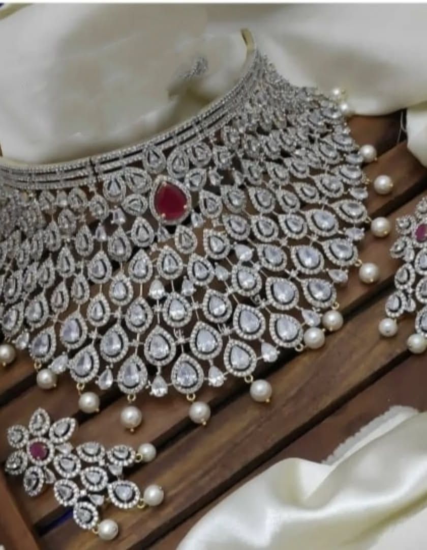 For your sangeet, reception, or cocktail party, I offer a stunning collection of modern jewellery. This includes diamond-look sets with white, blue, green, or red stones, as well as elegant Kundan, Polki, and Victorian-style pieces. These are designed to make you sparkle and shine.