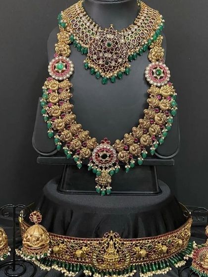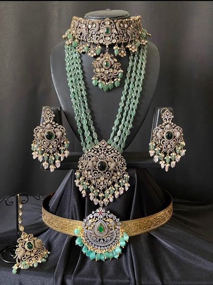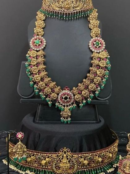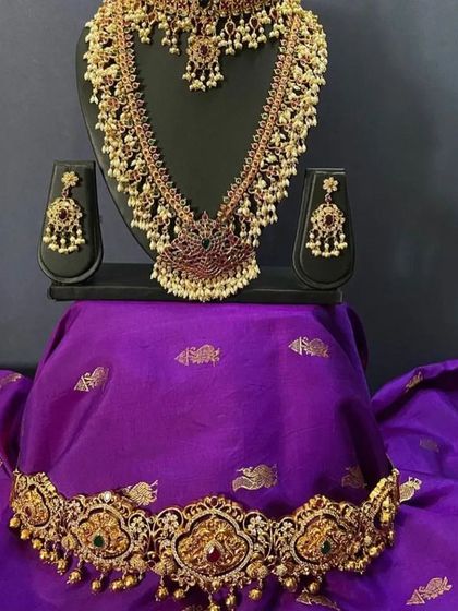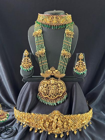 We specialize in renting exquisite South Indian bridal and traditional jewelry pieces. Our collection includes temple jewelry, kemp stone pieces, Victorian styles, and complete bridal sets featuring necklaces, earrings, chokers, waist belts, maang tikkas, and hair accessories.