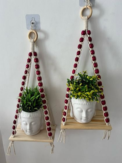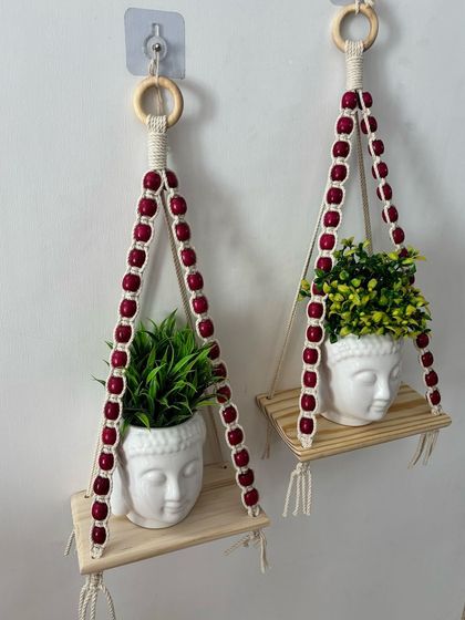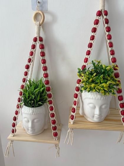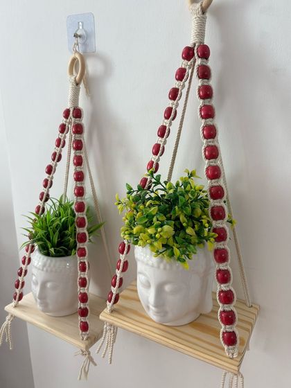 I create handcrafted macrame plant shelves that combine wooden platforms with intricate knotted designs. Each shelf is customizable with your choice of bead colors and patterns, perfect for displaying your indoor plants.