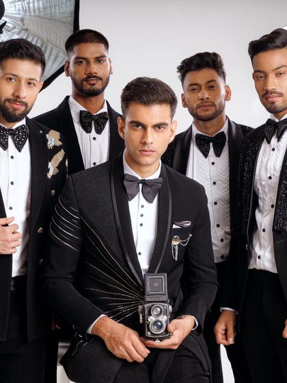 We design coordinated looks for your entire crew, ensuring everyone looks sharp without being identical. We mix and match styles like Jodhpuri jackets, modern suits, and classic kurtas to create a unified yet individual vibe for your groomsmen.