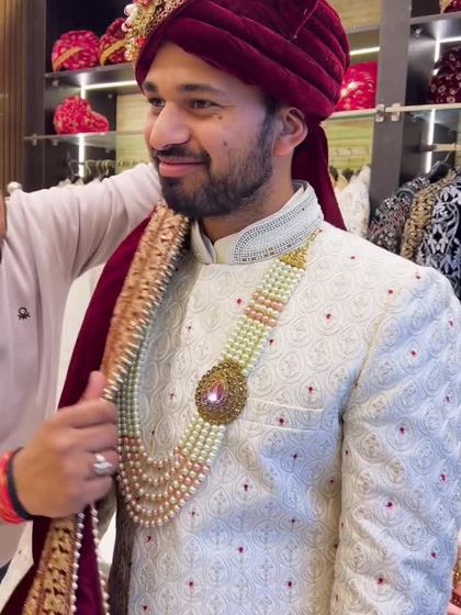For the main day, I make sure you get a sherwani that’s regal but not over the top. Think off-white, ivory, with cut dana work, or full thread embroidery. You get the whole package - pagri, stole, mala. Some guys want embroidered groom outfits, some prefer a minimal vibe. Your call.