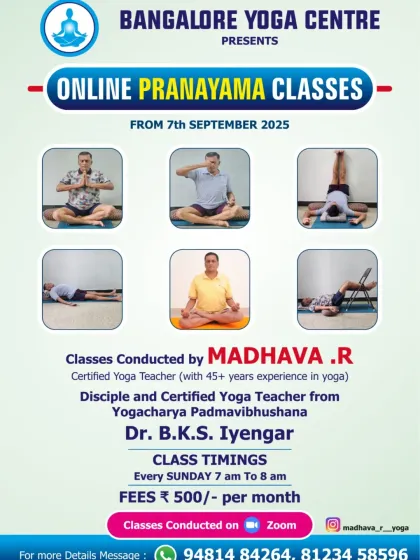 Namaskara! I’m Madhava, been living and breathing yoga for 45+ years. Iyengar yoga runs in my veins, thanks to my Guru, Dr. B.K.S. Iyengar. Everything I teach comes straight from him. Yoga isn’t just exercise - it’s strength, immunity, and a sharp mind. My Bangalore Yoga Centre’s been home to many students, and Bellur, Guruji’s birthplace, is close to my heart. Whoever wants to learn, I’m here. Vishwa yoga dinacharaneya shubhashayagalu (Happy International Yoga Day).