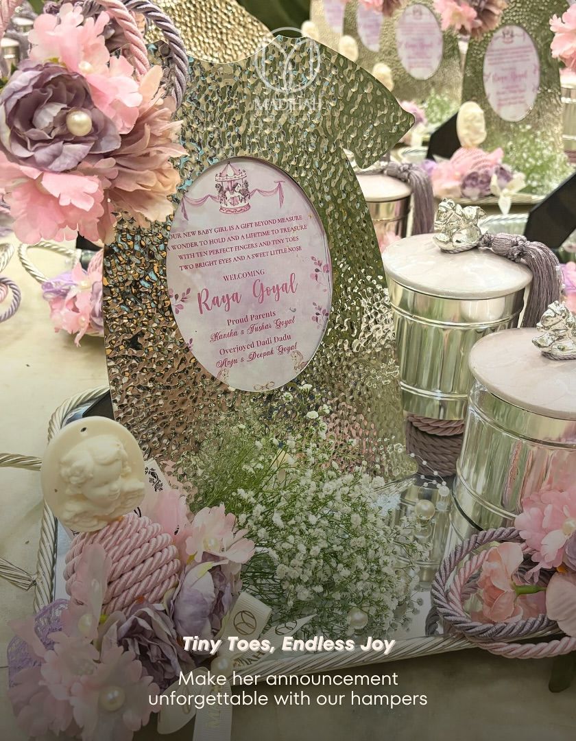 Celebrate the arrival of a precious little one with a gift that is as special as they are. Our baby announcement hampers are designed with grace and grandeur, featuring delicate silver-plated items, personalized frames, and other keepsakes. Each hamper is a beautiful way to share the joy of new beginnings.