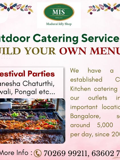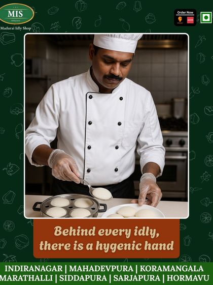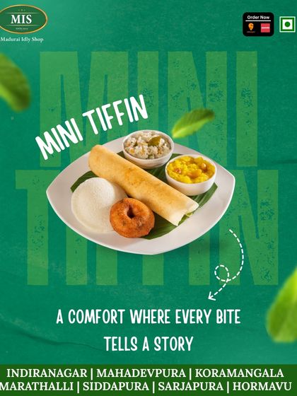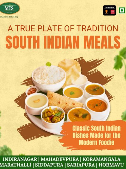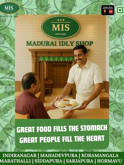 Vanakkam! We’re Madurai Idly Shop, serving Bangalore for more than 20 years now. Our food? Pure Tamil Nadu - soft idlis (no soda, just patience), crispy dosas, and filter kaapi that wakes you up. We’re here for those Sunday family brunches, late-night cravings, or just when you miss Amma’s cooking. RCB fans or not, you’ll find comfort here. Ee Sala Cup Namdu! Food, memories, and togetherness - that’s us.