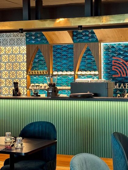We designed our restaurant to transport you to the Mediterranean. The decor features modern lines, cozy seating, and intricate tilework in shades of green and gold, creating a warm and stylish atmosphere for any occasion.