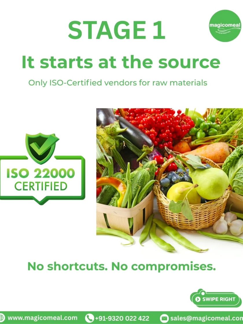 We deliver trust on every plate. Our ISO 22000:2005 certified operations are built on a 3-stage quality shield, ensuring every meal is sourced, prepared, and packaged with uncompromising attention to safety and hygiene.