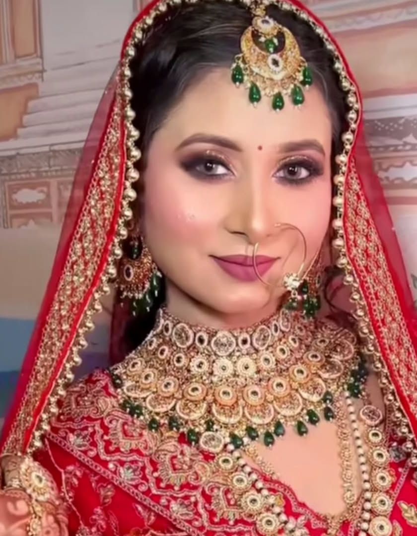 This is the ultimate *dhulhan* look. I offer a range of heavy red bridal lehengas paired with perfectly matched Kundan, Polki, and gold-look jewellery sets for your big day.