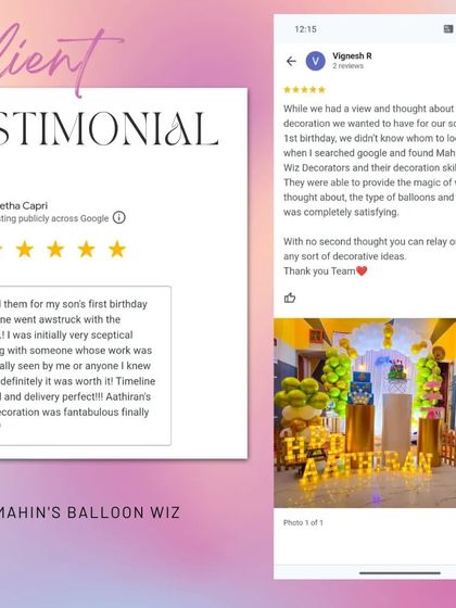 I decorate events with custom balloon setups, backdrops, lighting, and props, and I work with your ideas to create setups for birthdays, baby showers, and pre-wedding functions.