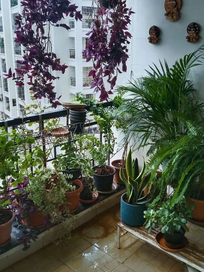 - Balcony garden design with potted and hanging plants