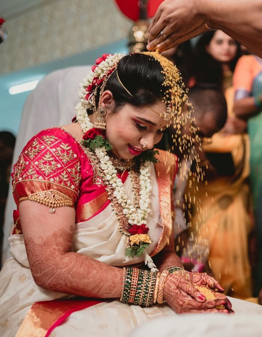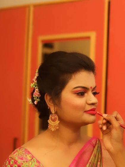 The Muhurtham ceremony is sacred, and the bridal look should reflect that. I create divine, traditional looks with a flawless base, classic kohl-rimmed eyes, and bold lips that stand out against a beautiful Kanjivaram saree, complete with temple jewelry.