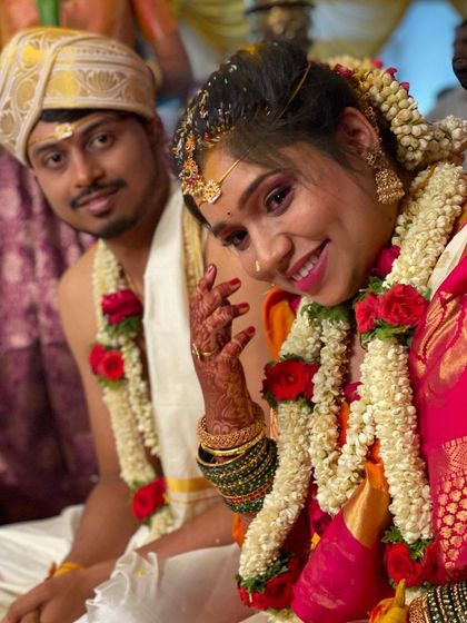 A South Indian bride's hairstyle is a work of art. I specialize in a variety of traditional and modern styles, from the classic Poola Jada with fresh flowers and temple jewelry to elegant buns and contemporary braids.
