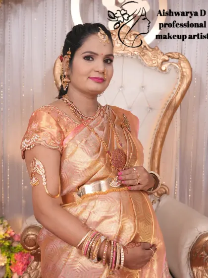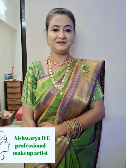 Hey! I’m Aishwarya D E from Bangalore. Makeup and hair is my jam, seriously. If you’ve seen my reels, you know I’m always vibing to Kannada and Hindi hits—Sandalwood and Bollywood, full-on fan! My first clients? My own family. Mom, sister… those moments are gold. I’m certified, ISO too (yep, for makeup!). I just want you to feel gorgeous and confident, that’s it. Glam, but with heart.