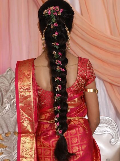 I do South Indian bridal makeup and hairstyling for all wedding events, focusing on natural looks and traditional hairdos with fresh flowers and accessories.