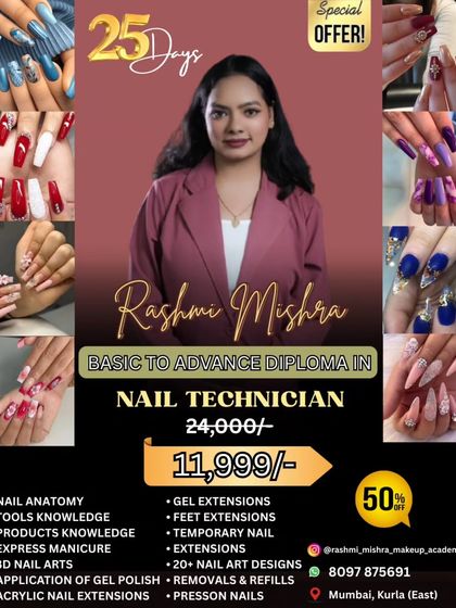 I teach nail technician courses with full hands-on practice, all materials provided, and an ISO-certified diploma, covering basics to advanced nail art and salon business skills.
