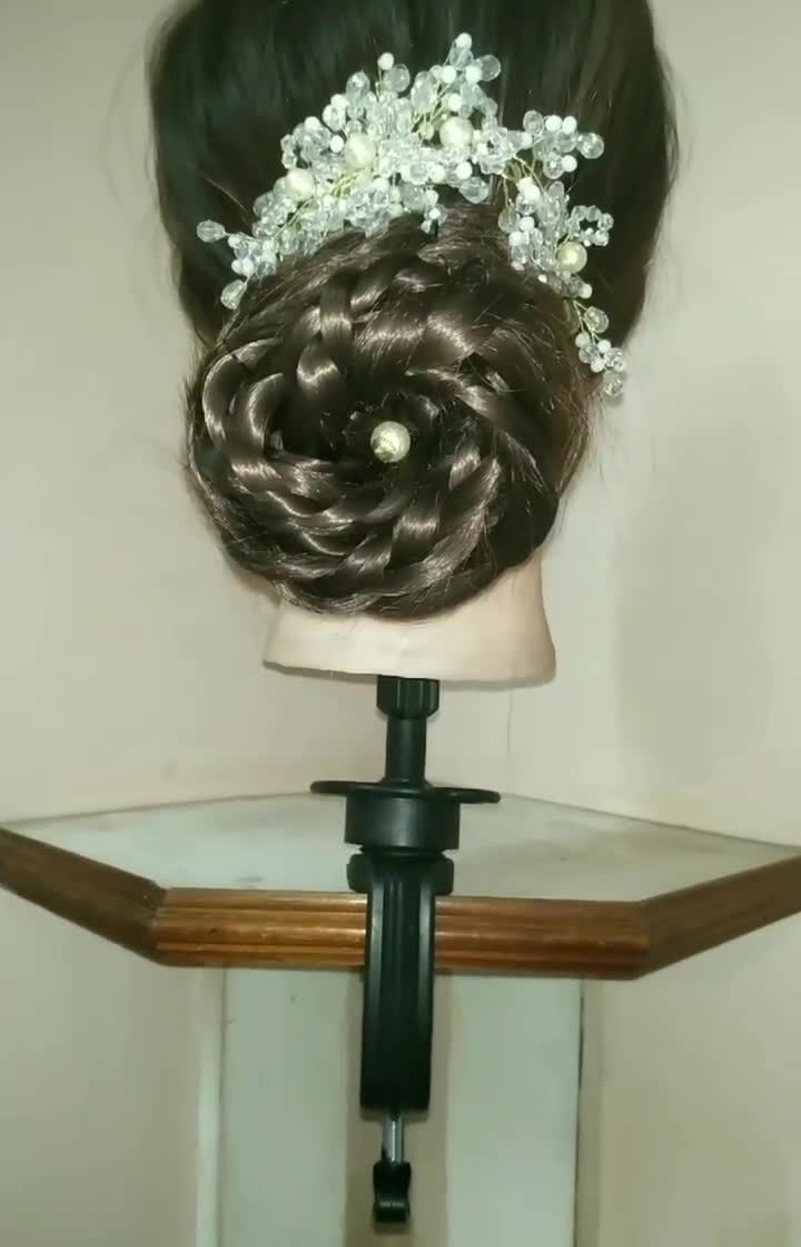 I create a wide range of elegant buns and updos, perfect for weddings, receptions, and parties. This gallery, shown on mannequins for clarity, displays various styles from classic floral buns to complex braided updos with modern accessories.