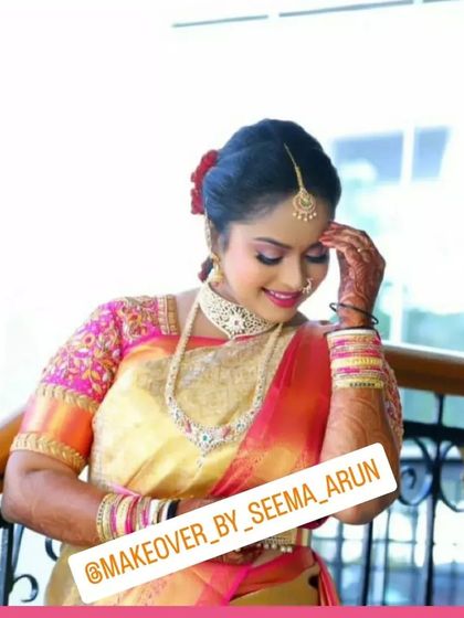 I specialize in creating complete, camera-ready looks for South Indian brides. This includes flawless HD makeup that lasts, traditional hairstyling like the 'poola jada' braid, and expert Kanchipuram saree draping for an authentic and elegant finish.