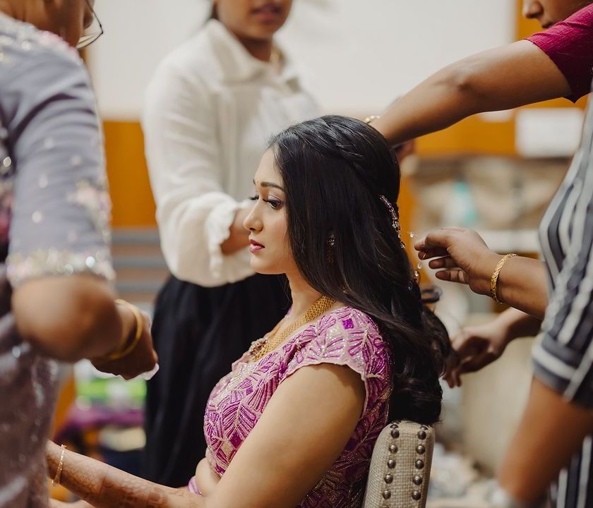 A hairstyle completes the look. Here, I've collected some of my favorite hairstyles, from traditional South Indian braids with flowers and jewels to modern updos and soft, romantic curls, showing the little details that make a big difference.