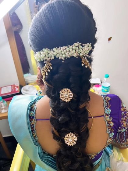 Your hairstyle matters as much as your makeup. From simple, elegant buns to traditional South Indian braid styling with jasmine flowers, I’ll work with you to pick something that matches your saree, your jewellery, and the vibe of your event.