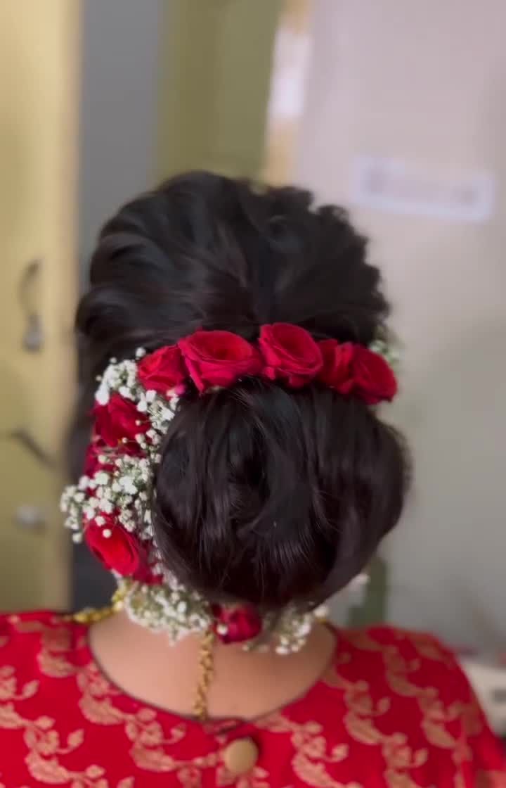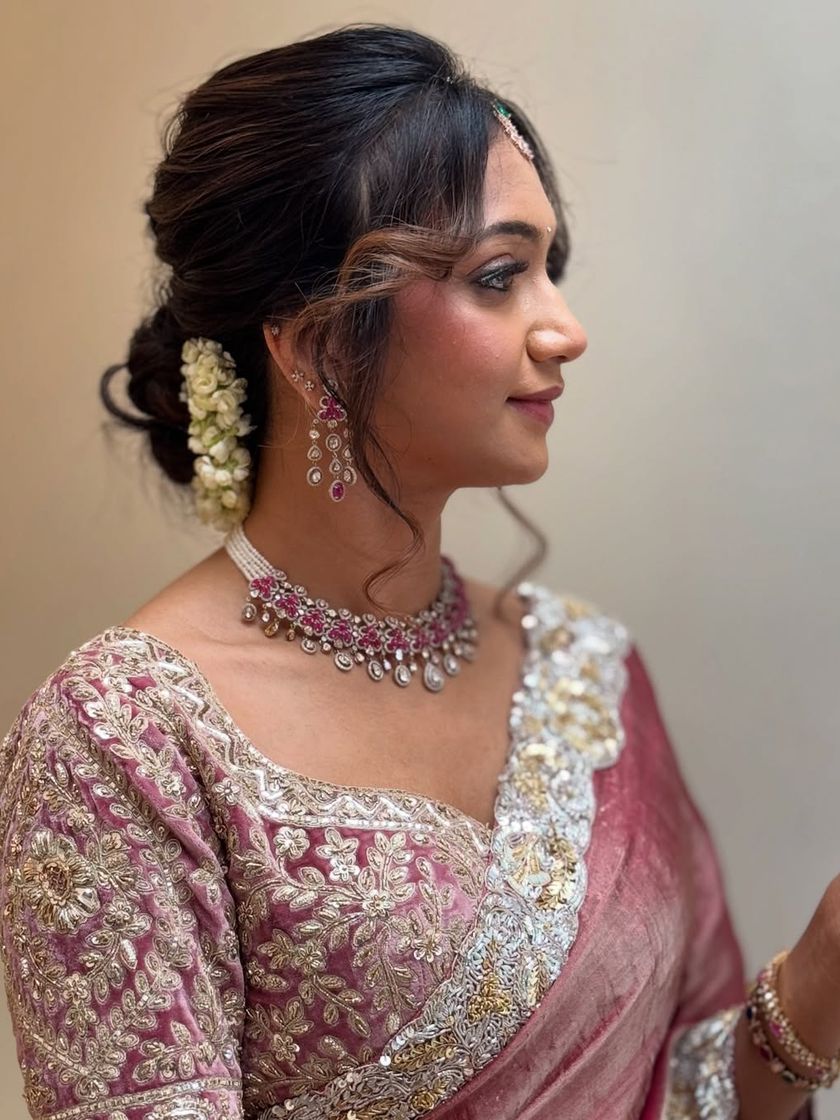 A great hairstyle completes the look. I create everything from traditional South Indian braids with fresh flowers to elegant buns and modern soft curls. I also pay close attention to details like saree draping to ensure your entire look is perfect.