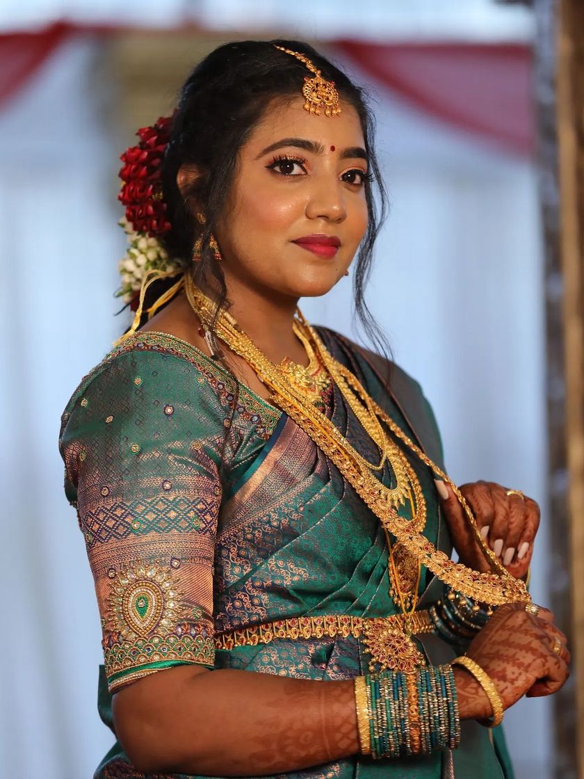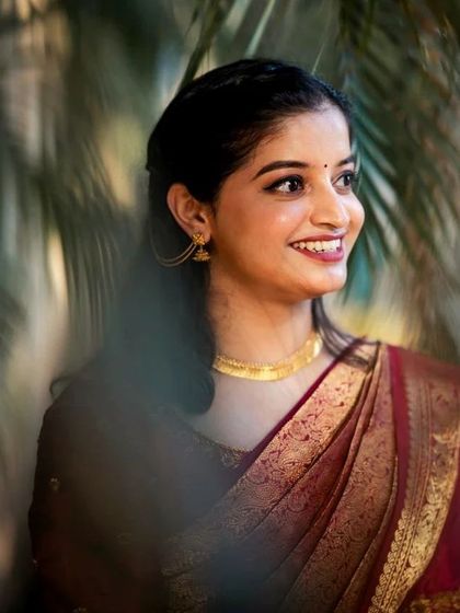 I specialize in creating timeless looks for the main Muhurtham ceremony that last all day. My focus is on a flawless base that complements traditional silk sarees and heavy jewellery, with eye makeup ranging from classic soft tones to dramatic smokey effects.