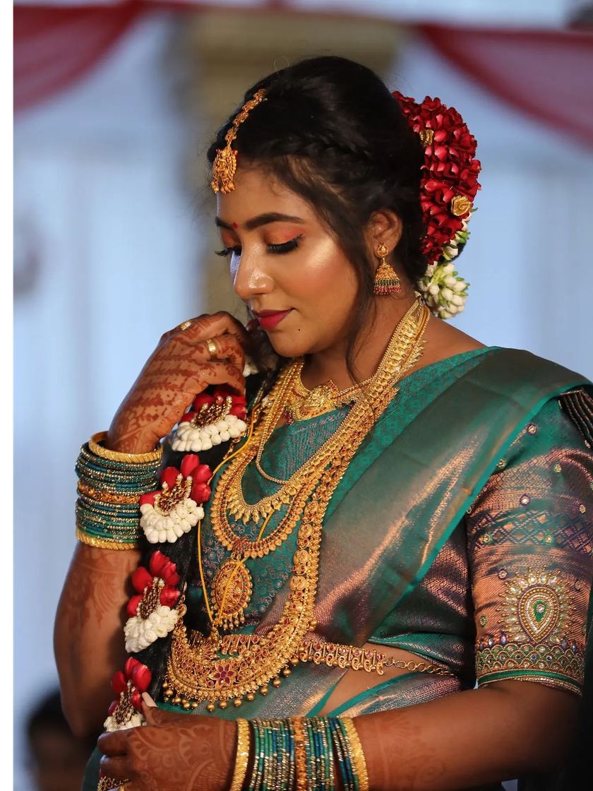 Your hairstyle completes your bridal look. I create a variety of styles, including intricate traditional South Indian braids with fresh flowers (malli poo), elegant buns, and romantic updos or loose curls for modern events.