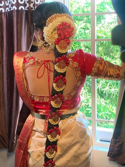 Traditional & Modern Styles - From bold red lips to subtle bridesmaid makeup, I mix classic South Indian bridal hairstyle with modern touches.