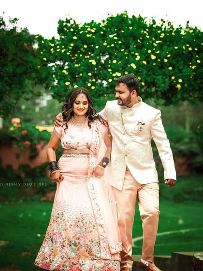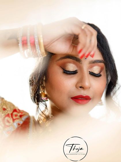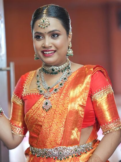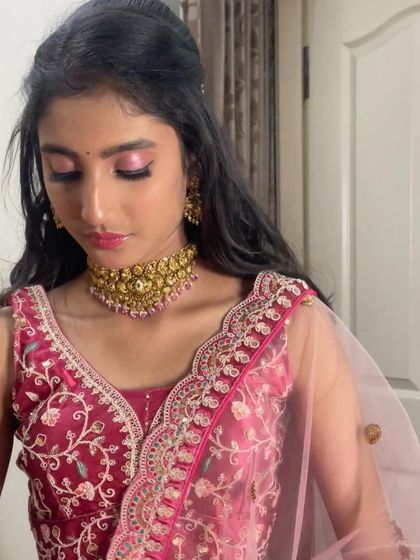 I do natural finish bridal makeup and South Indian hairstyles for all wedding events, with quick and calm service tailored to your style.