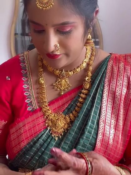 I specialize in creating the quintessential South Indian Muhurtham look, ensuring it complements the Kanjivaram saree and temple jewellery. My focus is on a flawless, long-lasting base that looks fresh throughout the ceremony and makeup that enhances your features beautifully.