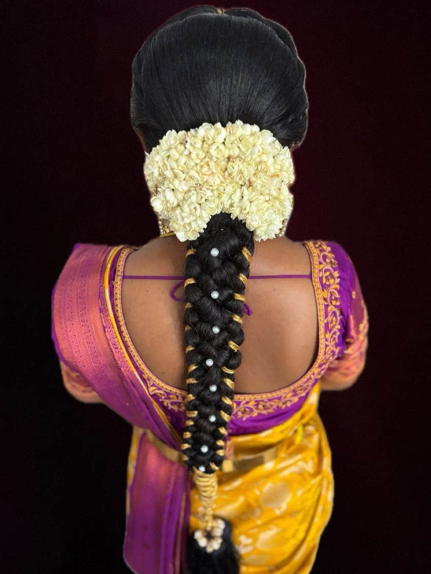 I offer a wide range of bridal hairstyling services, specializing in the traditional South Indian floral braid (Poola Jada). I also create modern styles like messy braids, elegant buns, and voluminous curls, using the right accessories to perfect the look.