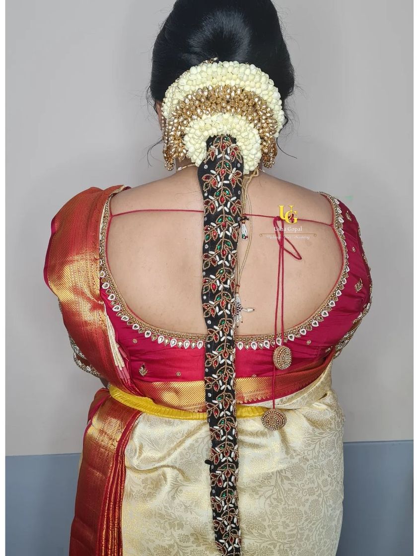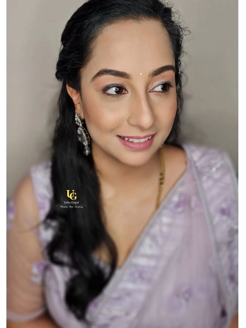 Your hairstyle completes your look. I create a wide variety of styles, from traditional South Indian braids and buns decorated with fresh flowers and hair jewels, to modern reception updos, voluminous curls, and elegant party hairstyles.