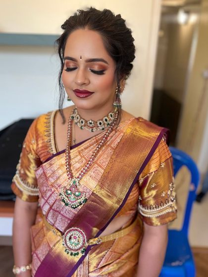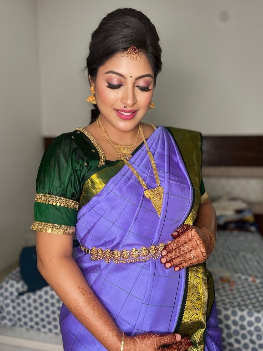 I specialize in creating radiant and comfortable makeup for moms-to-be, ensuring you look and feel beautiful throughout your special day. My looks are designed to complement traditional silk sarees and last through all the rituals and happy moments.