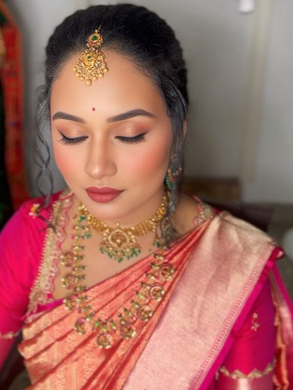 I love creating age-appropriate yet festive looks for half saree and puberty ceremonies, a beautiful South Indian tradition. I focus on enhancing natural beauty with a touch of shimmer, creating a look that is both elegant and memorable for this important milestone.