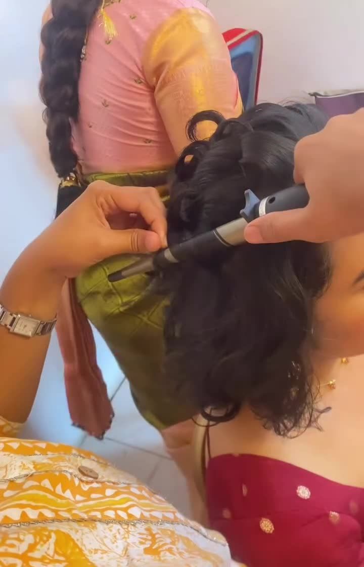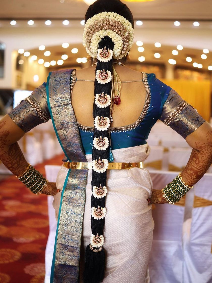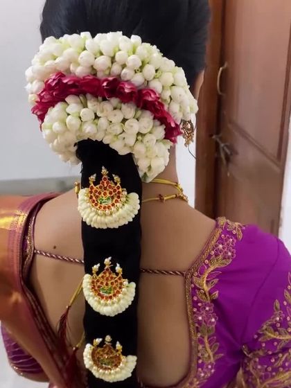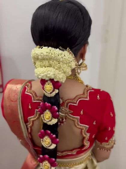 Bridal hairstyling is an essential part of your look, and I provide it as part of my package. I create everything from the traditional, heavily adorned Poola Jada floral braids for the muhurtham to modern updos, romantic waves, and chic braids for your reception and other events.