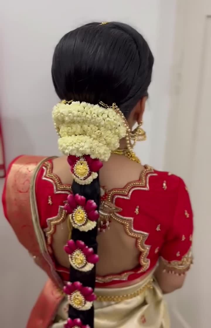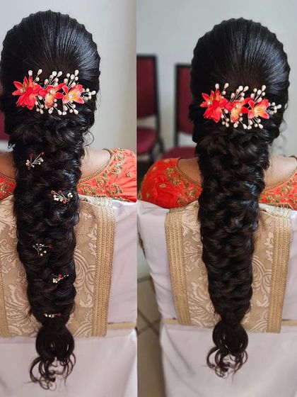 Your look isn't complete without the perfect hair. I provide a range of hairstyling services, from intricate traditional South Indian braids adorned with fresh flowers and jewellery, to modern updos and soft, romantic curls.