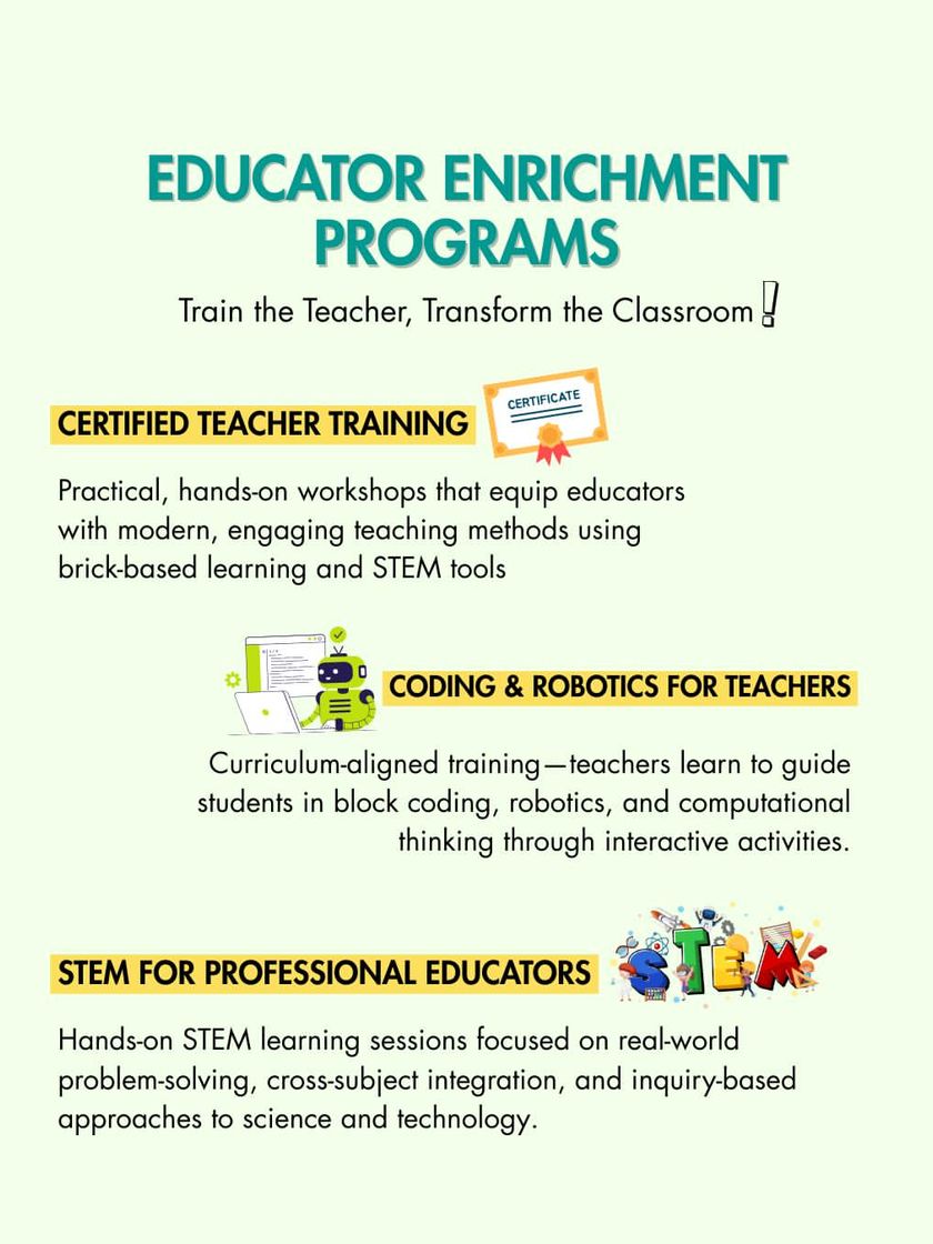I offer certified training programs designed to equip preschool and early years teachers with modern, engaging teaching methods. These hands-on workshops focus on using brick-based learning, STEM tools, and robotics to transform your classroom and meet curriculum objectives.